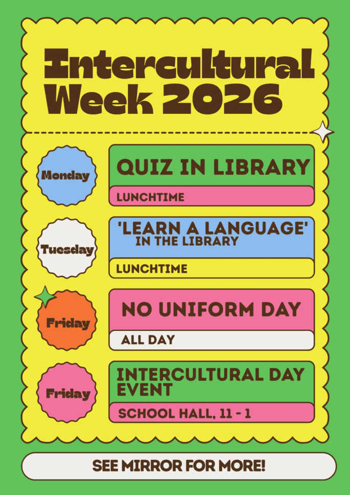 We are excited to celebrate Intercultural Week once again in Mount Carmel! There are lots of exciting events going on over the next few days for students to get involved in. We are looking forward to seeing everyone come together to celebrate the diversity of our school.
