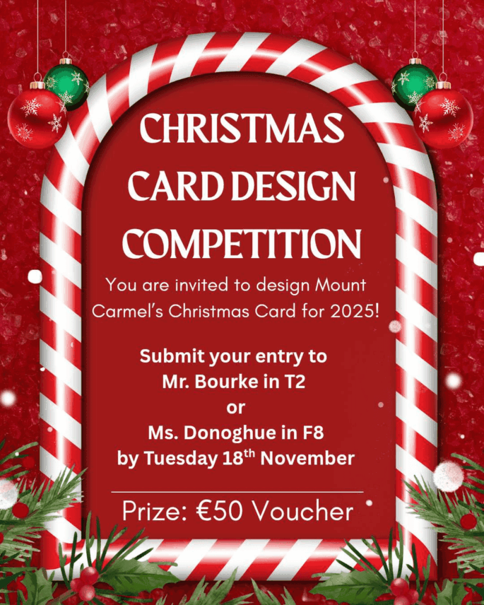 Students are invited to submit designs for the 2025 School Christmas Card. Entries are to be submitted by Tuesday 18th November.