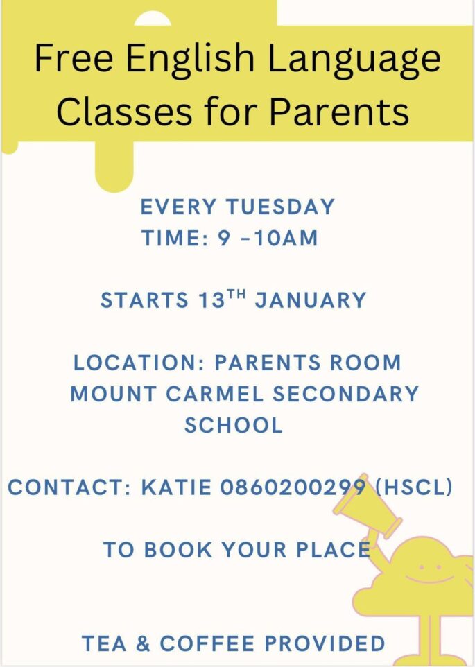 A reminder that we are hosting free English classes for parents every Tuesday morning from 9am to 10am starting tomorrow. Register your interest with our HSCL, Katie.