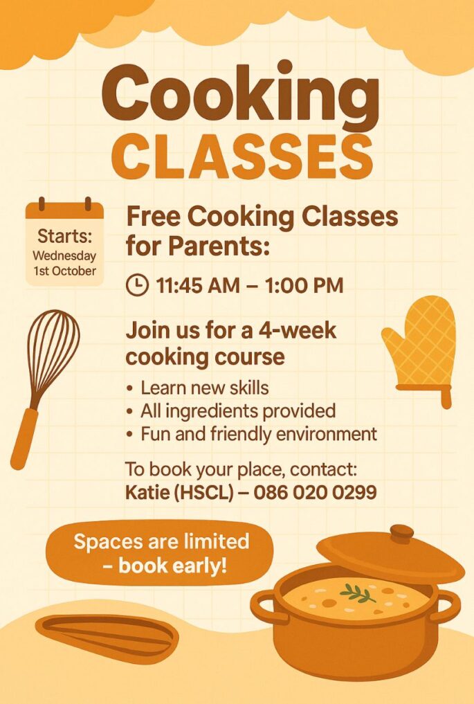 Free 4 week cooking course starting Wednesday 1st October for Parents. All ingredients supplied.