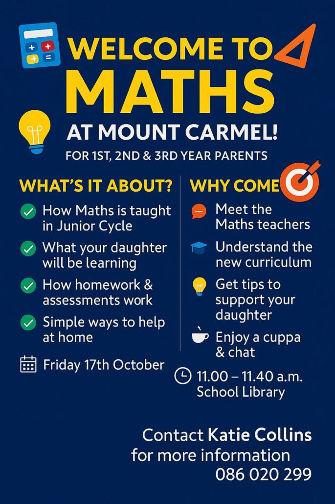 Maths Week for Parents October 14, 2025October 15, 2025 by Mount Carmel Secondary School Please pop in for a cup of tea & a chat this Friday @11am about how you can support your daughter with Maths in Mount Carmel. All 1st, 2nd & 3rd Year Parents welcome Contact: Katie HSCL 0860200299