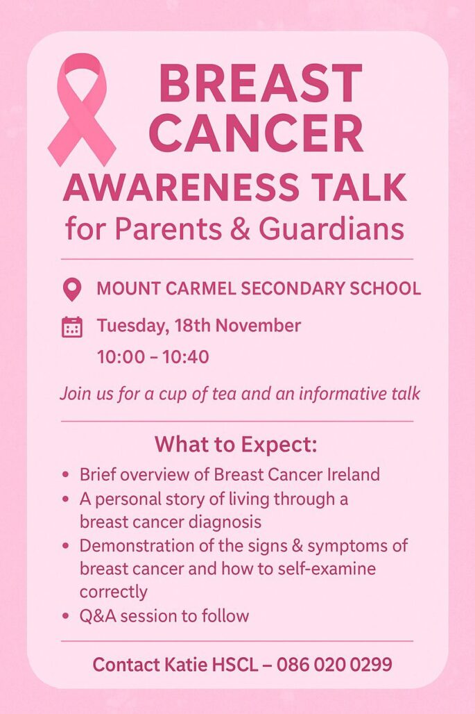 Parents & Guardians please join us tomorrow for tea & cake and an informal chat about Breast Cancer Awareness at 10- 10 40am in the Parents Room.