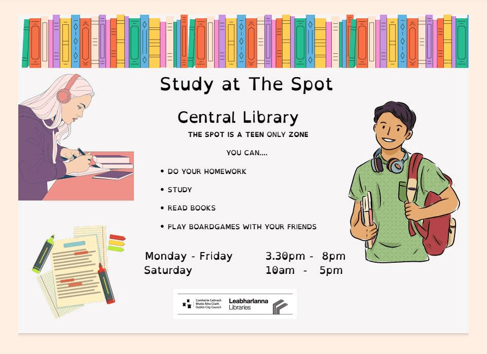 Study at the Spot: The Central Library invites teens to study, socialise, and have fun together at a designated teen only area a few days a week. Here students can study with friends, play games or enjoy some reading. See the attached poster for more details.