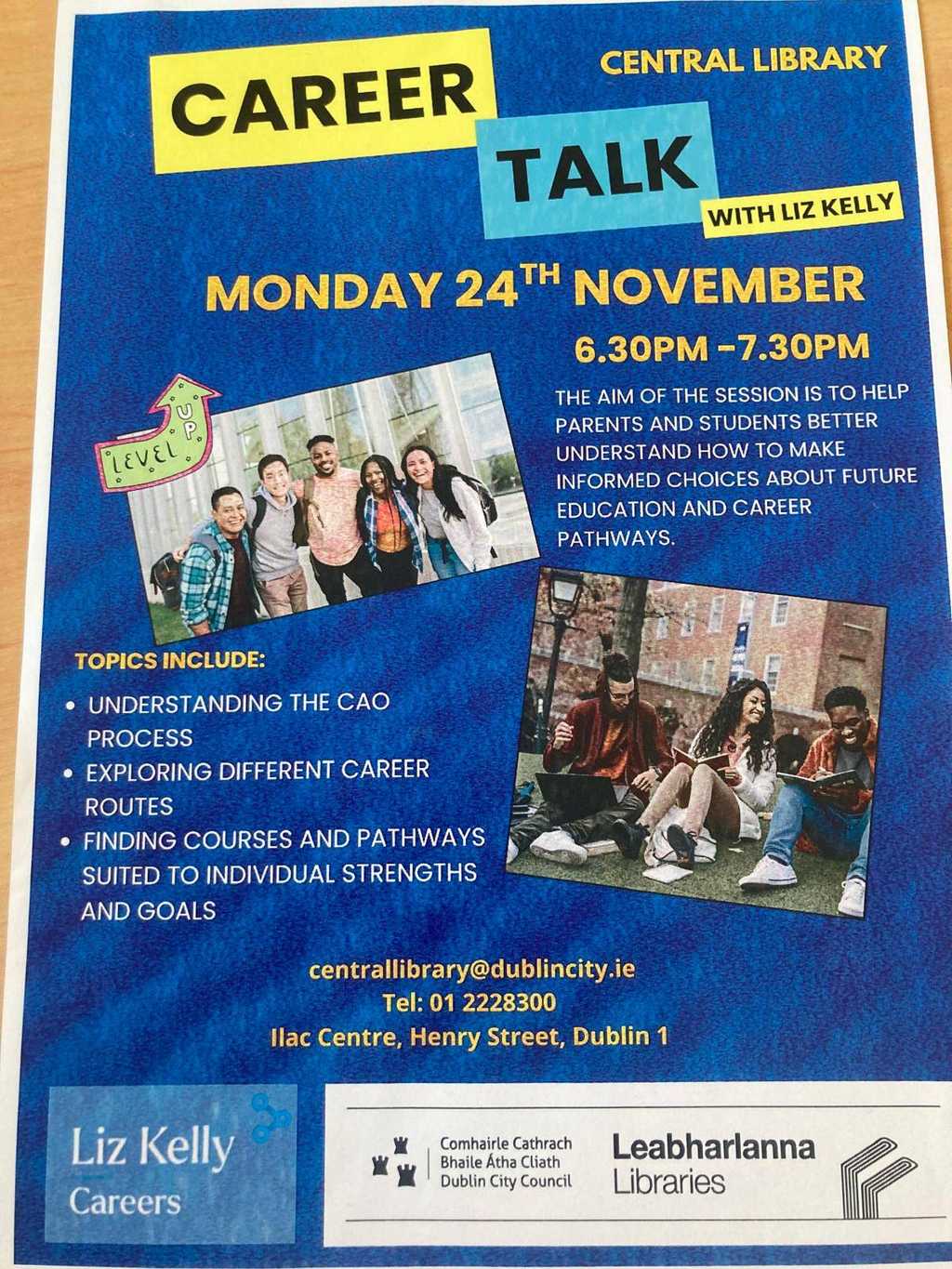 test [pt_view id=”1831a0dhac”] Career Talk at the Central Library 2025/11/21 08:15:27Dublin Central Library is hosting a free career talk for parents and students on Monday the 24th of November. Follow the link for further details: https://www.dublincity.ie/events/career-information-talk Read More