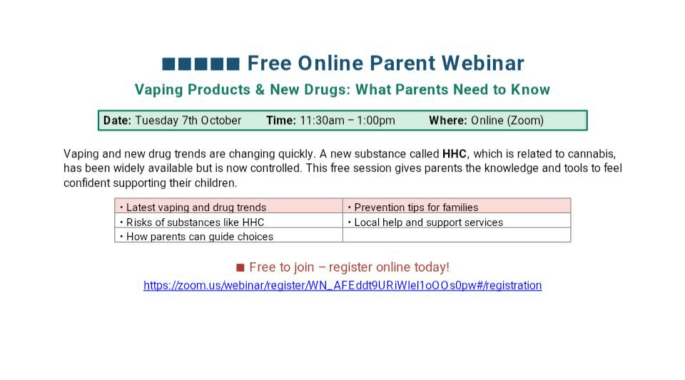 A free webinar on vaping products is scheduled for this Thursday, the 7th of October from 11.30am to 1pm. Parents can register via the zoom link.